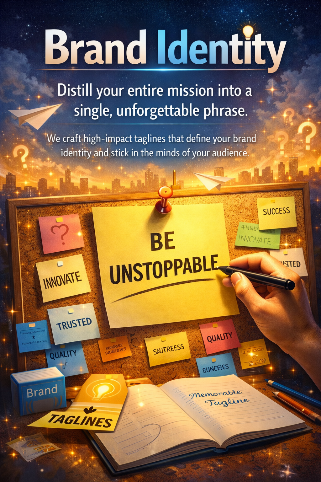 Distill your entire mission into a single, unforgettable phrase. We craft high-impact taglines that define your brand identity and stick in the minds of your audience.