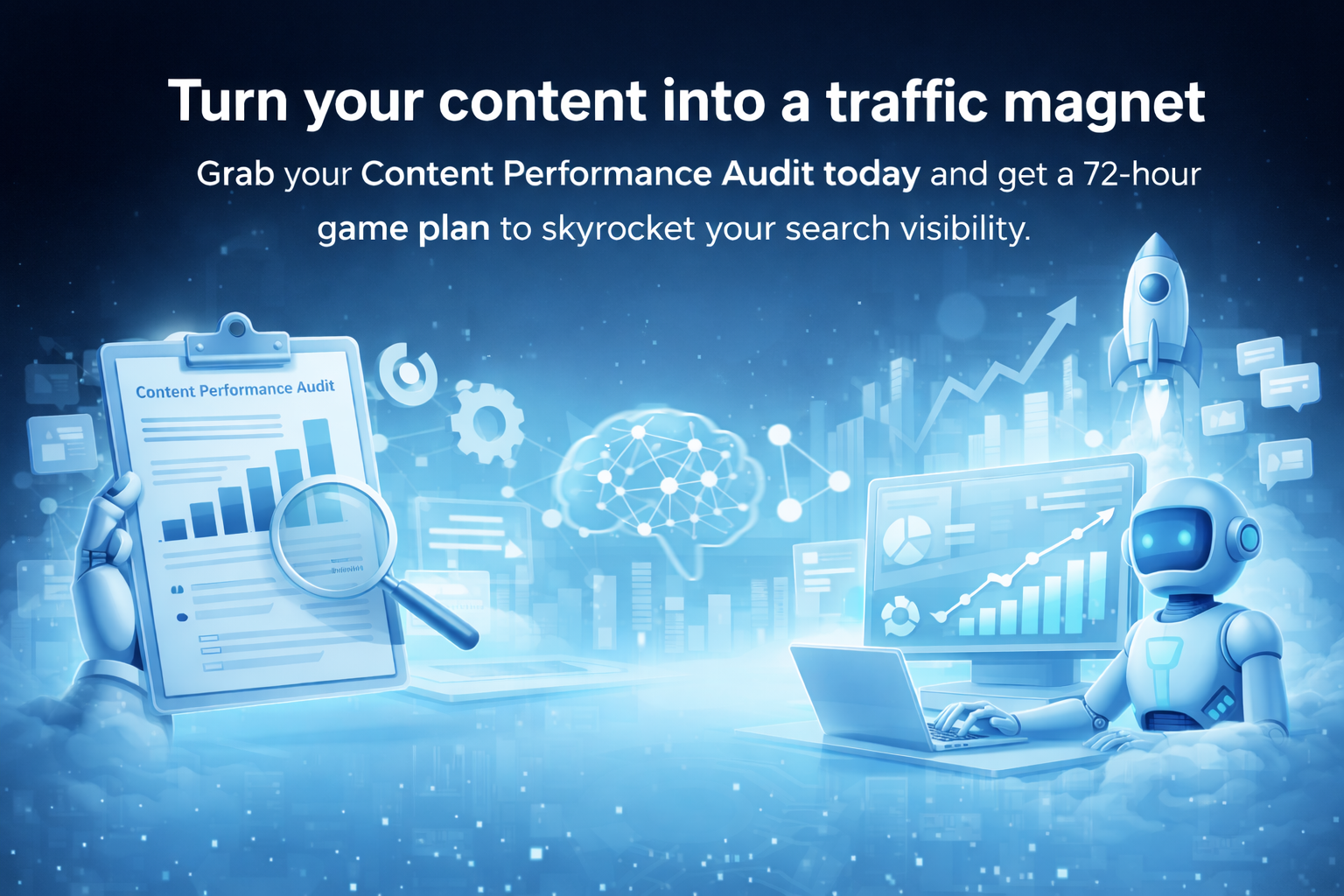 Turn your content into a traffic magnet. Grab your Content Performance Audit today and get a 72-hour game plan to skyrocket your search visibility.